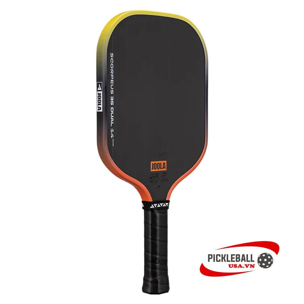 Với viền bảo vệ 14mm nổi bật cùng hiệu ứng chuyển màu cam – vàng rực rỡ, JOOLA Scorpeus 3S Dual không chỉ gây ấn tượng về ngoại hình mà còn gợi hình ảnh mặt trời lặn – biểu tượng cho sức mạnh và sự bền bỉ. Đặc biệt, cây vợt này đạt chứng nhận kép chuyên nghiệp từ UPA-A Pro và USAP PBCoR.43, đảm bảo hiệu suất thi đấu tối ưu – giúp bạn tự tin thể hiện phong độ cả ngày lẫn đêm.